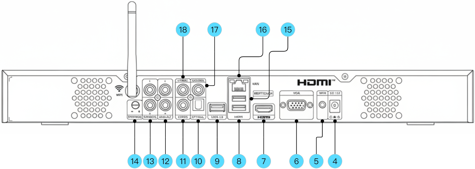| 17 | 同轴音频输出 | 18 | CVBS视频输出 |