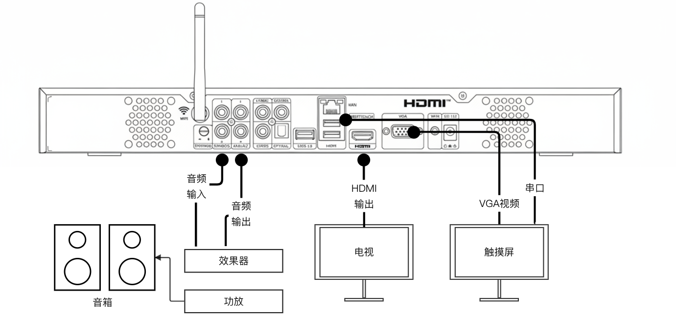 检查电视或音响的连接线是否正常。特别是点歌机后挡板的音视频输入输出口:电视接HDMI口、音响接音频AV输出口或光纤、同轴。