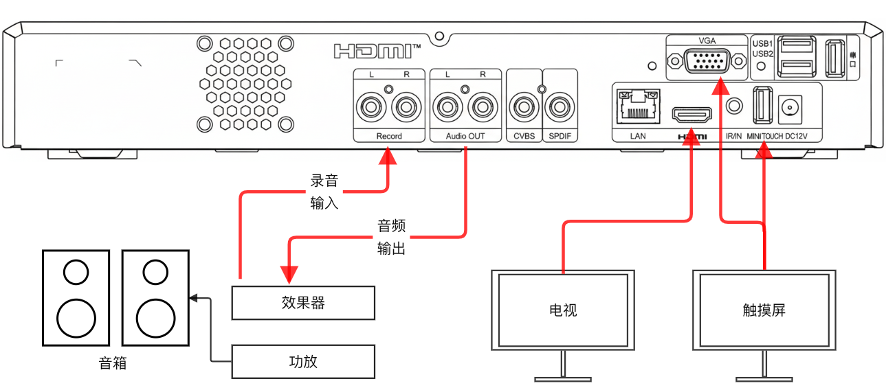 检查电视或音响的连接线是否正常。特别是点歌机后挡板的音视频输入输出口:电视接HDMI口、音响接音频AV输出口或光纤、同轴。